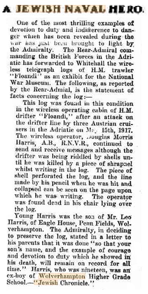 The story, found in the 28 September 1917 edition of The Hebrew Standard of Australasia, confirmed that Morris was, in fact, Jewish. Upon further analysis, records can be found of the bar mitzvah of Douglas’ brother, Gerald, at the Wolverhampton Synagogue. Upon looking into Leopold’s family tree, he was the son of Morris Hart Harris, who was descended from a line of Cornish Jewry. The line can be traced back to Germanic Europe in the early 1700s. What is particularly interesting however, is that Douglas’ mother can trace her ancestry back through several Christinan vicars. Perhaps it is this that has meant his Jewish ancestry has largely been forgotten over the years.